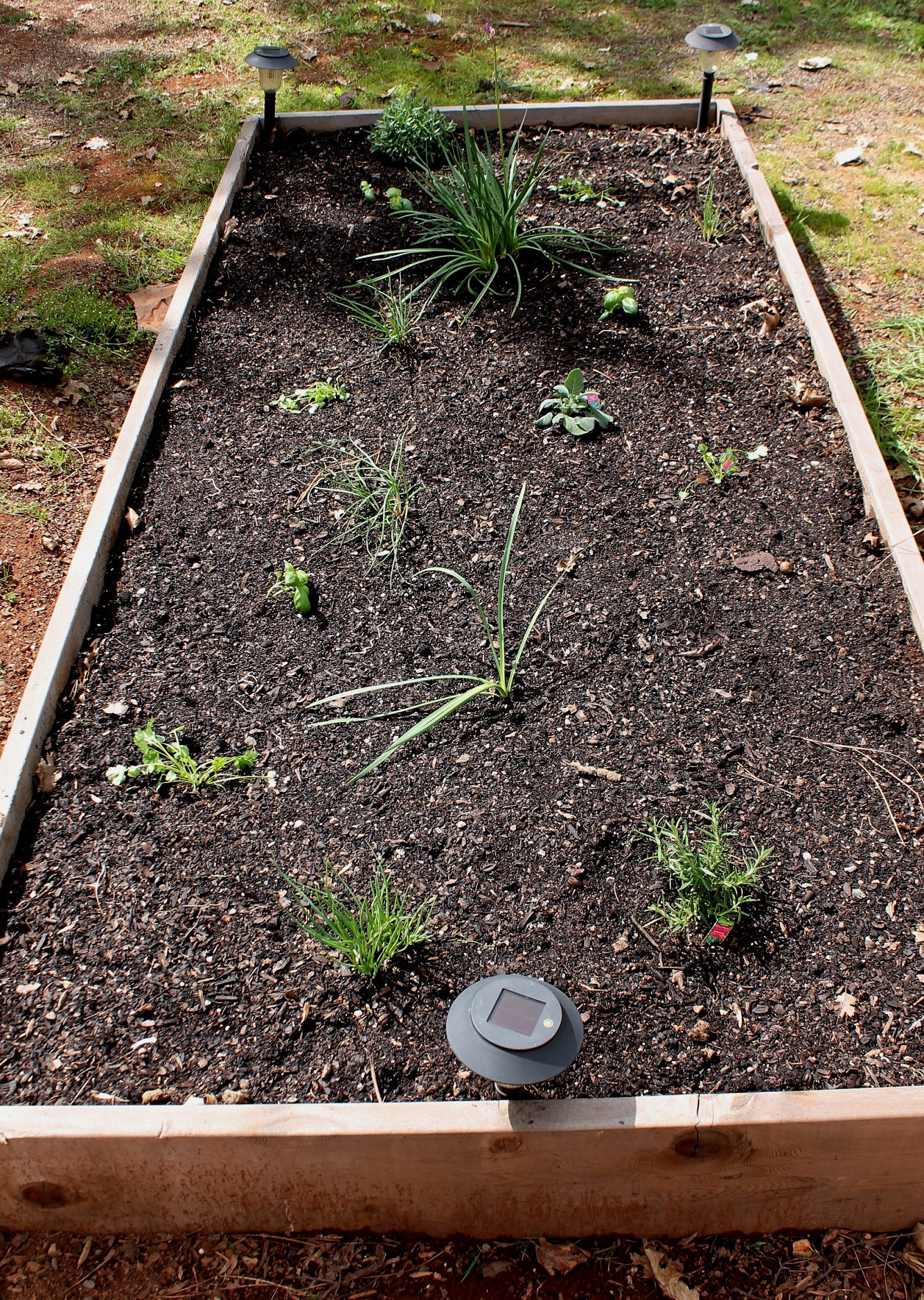 To the right is the herb garden.  There were still a few onions left from last year.  I planted lavender, sage, cilantro, garlic greens, basil and rosemary.  We’ll plant oregano and thyme sometime in the future.