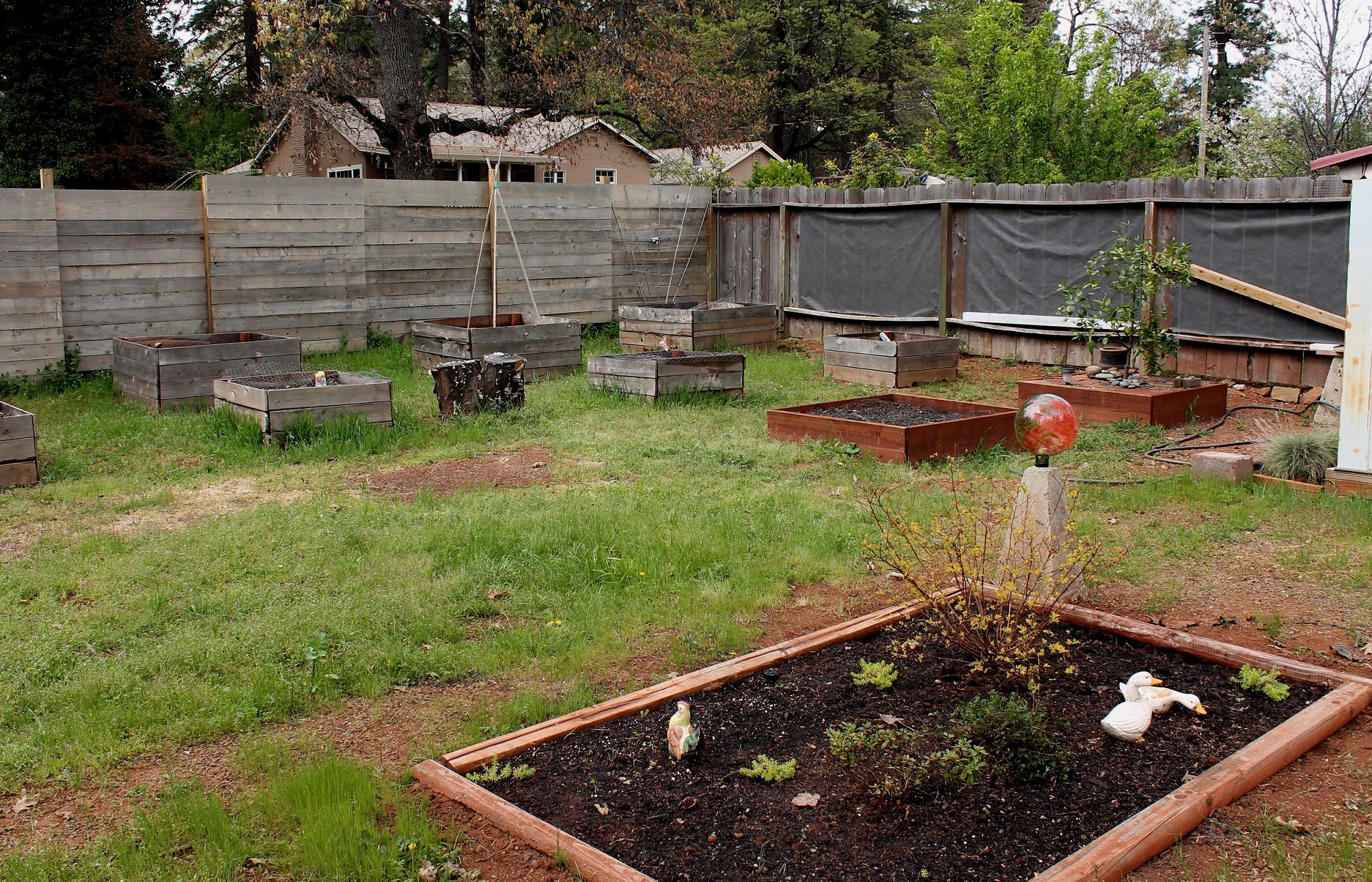 …..see?  Not a huge difference, but I got some seeds planted and moved a few boxes.  Dee “planted” the gazing ball and moved the decorative grasses over by the shed.
