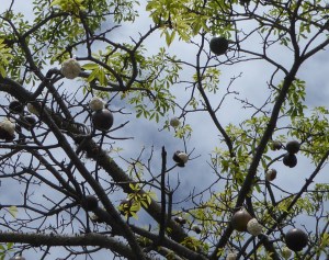 This is a kapok tree. I’ve never seen one before, but I recognized it right away because of the fuzzball seed pods. (You’ll probably need to click on the photo to see them better). The white flowery looking things fluff out to look like cotton and it’s been used to produce fabric for time out of mind. Being a fabric nut, I found it a pretty cool thing to see.