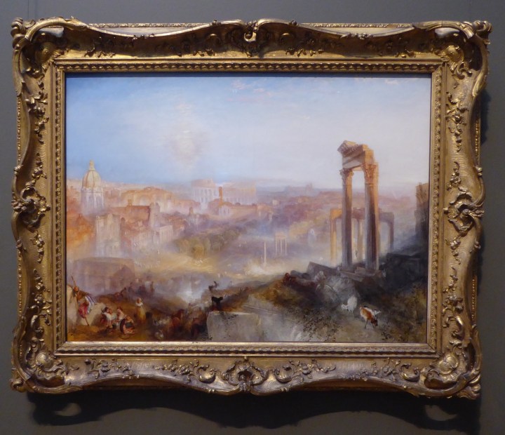“Modern Rome – Campo Vaccino” by William Turner. I’ve wanted to see a Turner for a long time and was not disappointed here. Even with oil he created such translucence. I feel compelled to share the description offered by the Museum: “Ten years after his final journey to Rome, Turner envisioned the Eternal City through a shimmering veil of memory and imagination. Baroque churches and ancient monuments in and around the Roman Forum seem to dissolve in iridescent light shed by a moon rising at left and a sun setting behind the Capitoline Hill at right. Amid these splendors, the city’s inhabitants carry on with their daily activities. Untouched since it left Turner’s hands, the painting is in a remarkable state of preservation. It is shown here in the frame originally chosen by the artist.”
