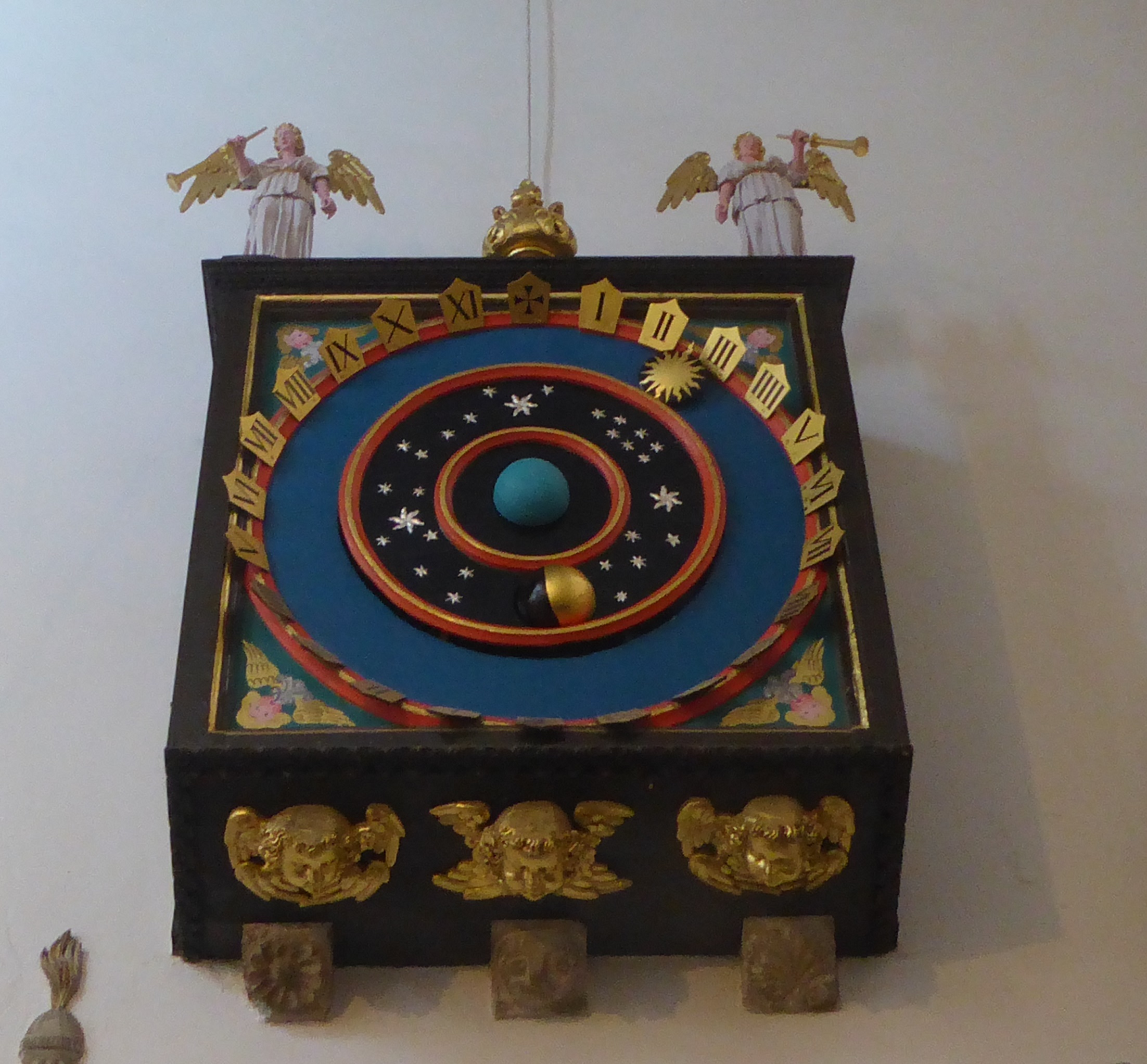 Notice that the clock face represents the geocentric model, the heliocentric model not having yet been figured out!