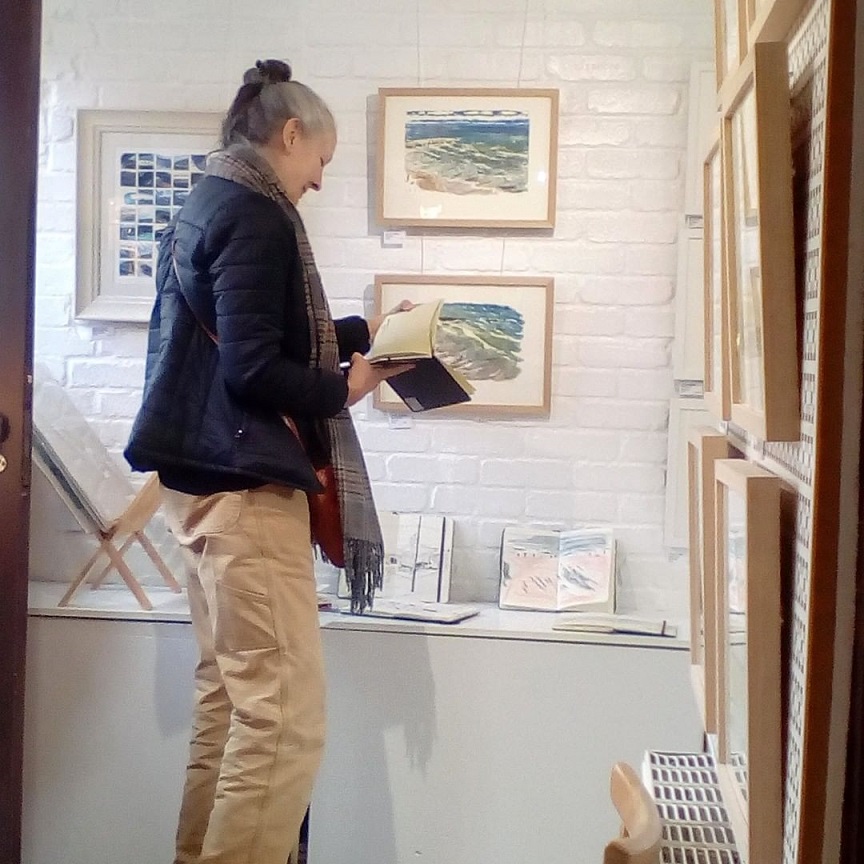 However, she got this picture of me (with some of the artwork on the wall) admiring one of her sketchbooks.