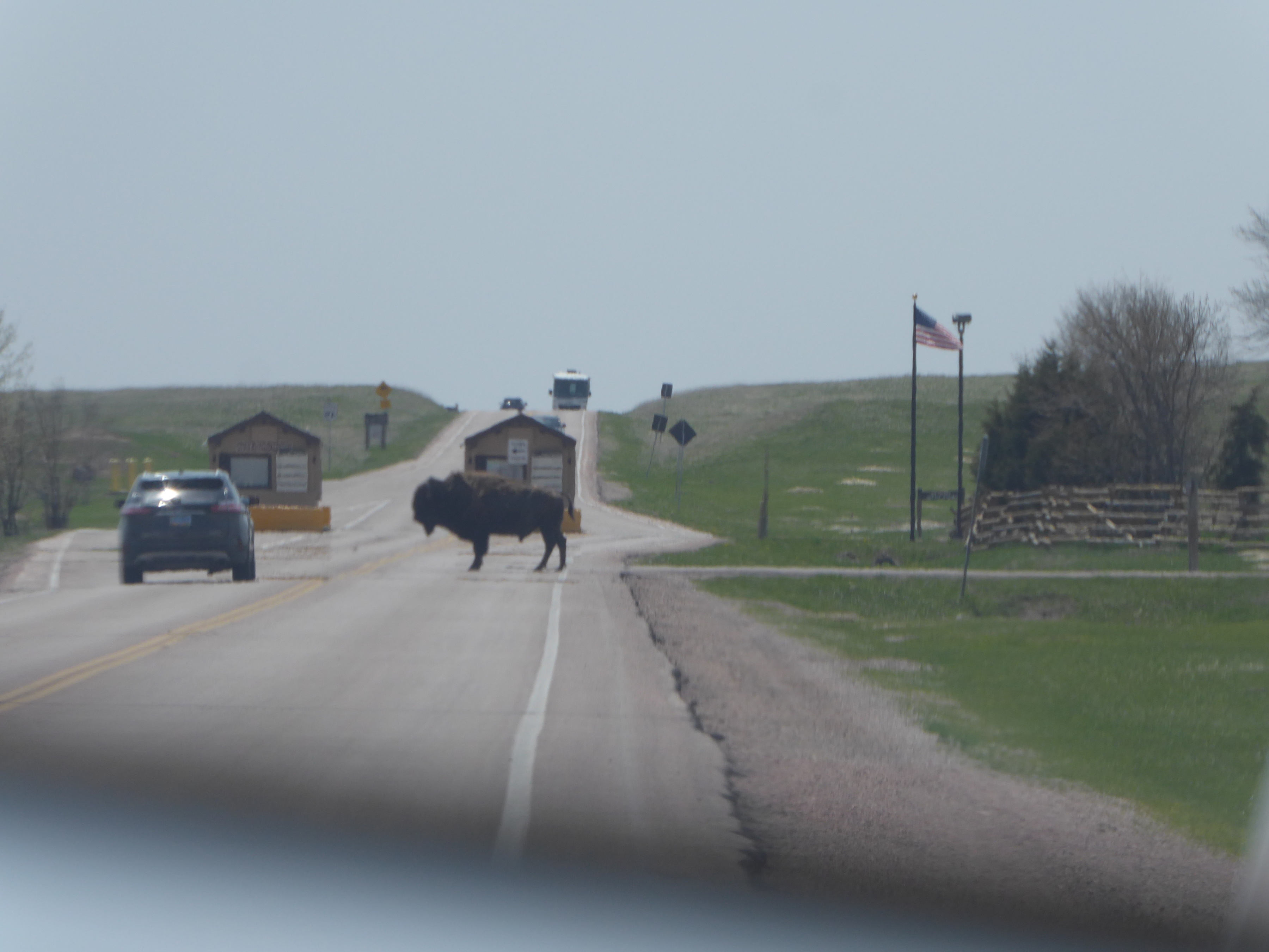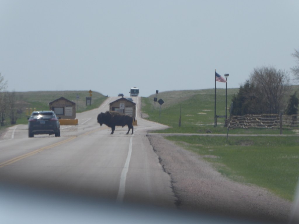 One last sighting of a bison – as I exited the Park, I looked in my rear view mirror and saw this. Just a bison strolling along, blocking the entrance!